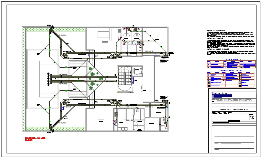 O projeto de instalações hidrossanitárias contempla plantas baixas de água fria e esgotos, isométricas de água fria e detalhamento dos gabinetes sanitários que contenham peças sanitárias com tubulações de esgoto primário e secundário. A abrangência do projeto inclui chegadas e saídas de água dos reservatórios, pontos de água fria, pontos de esgotos, inclusive trajeto das tubulações, captação e instalações de drenagem de águas pluviais.